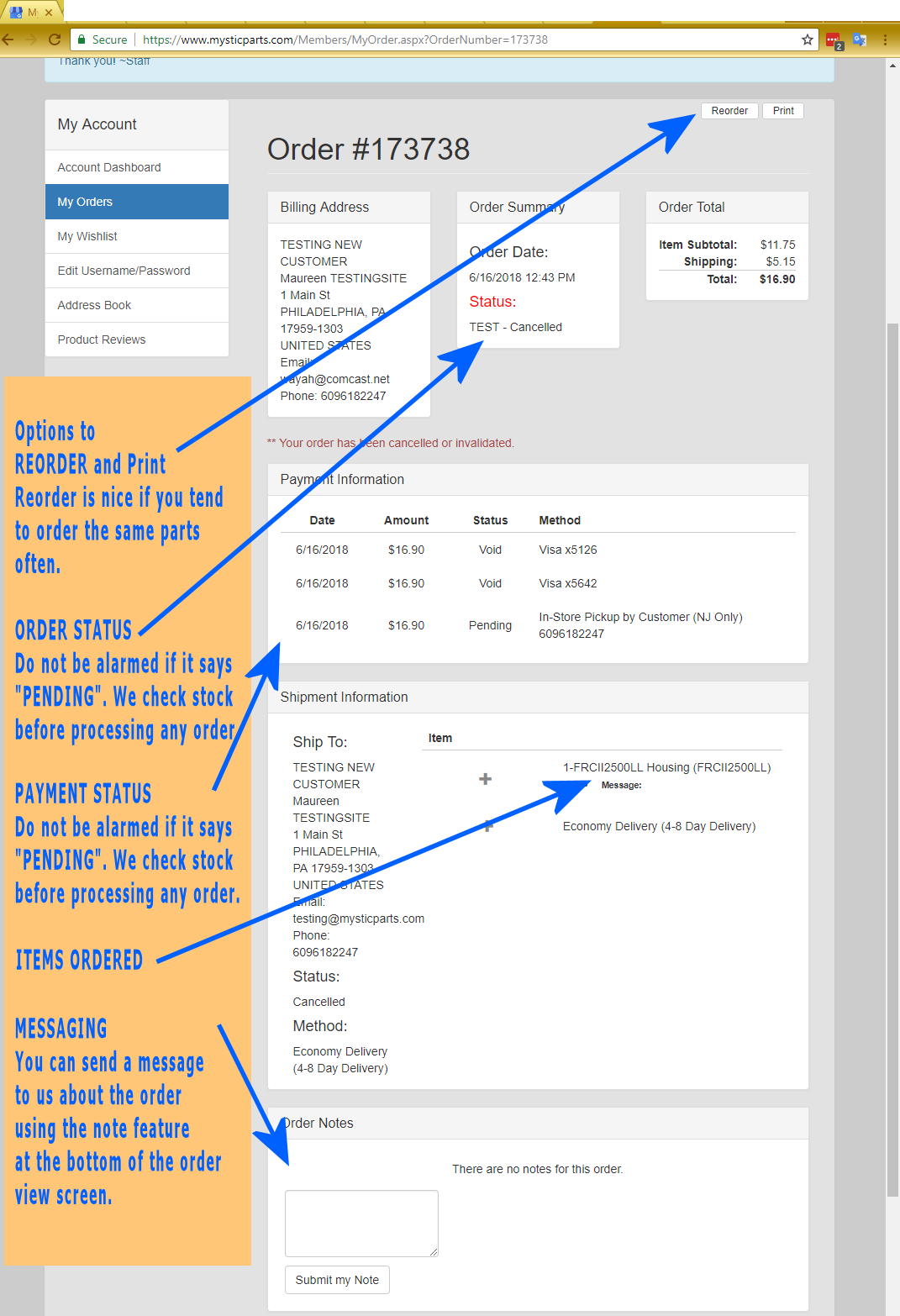 Notes on the image below will explain the different items in the order display. The key item is the ability to contact us about the order directly using the "Order Notes" feature.